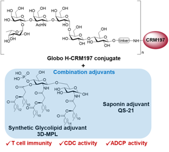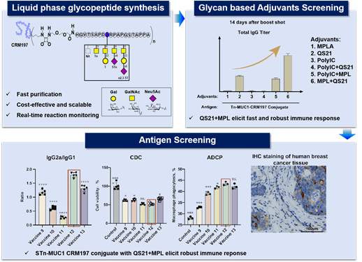 团队采用液相化学酶法合成技术,制备了四种MUC1糖肽抗原及Globo H六糖抗原,并将其与载体蛋白CRM197高效偶联。CRM197作为载体蛋白,可通过激活T细胞依赖的免疫激活,使宿主产生更强的免疫应答。