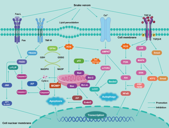 图1. 蛇毒毒素诱导肿瘤细胞程序性死亡的分子机制。