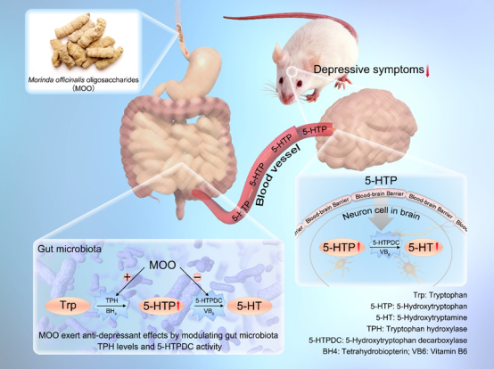 Morinda officinalis oligosaccharides increase serotonin in the brain and ameliorate depression via promoting 5-hydroxytryptophan production in the gut microbiota Acta Pharma Sin B 2022. DOI: //doi.org/10.1016/j.apsb.2022.02.032