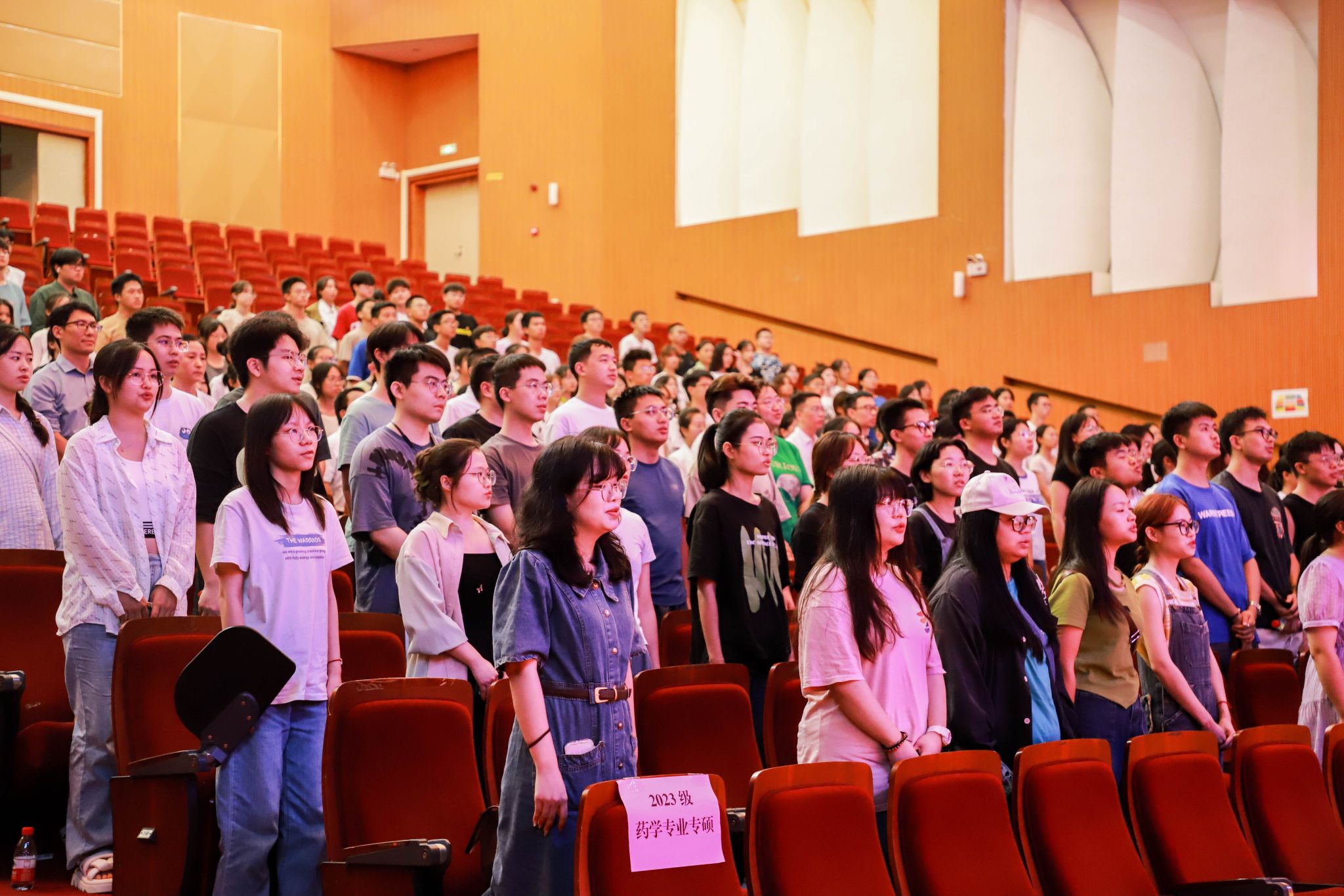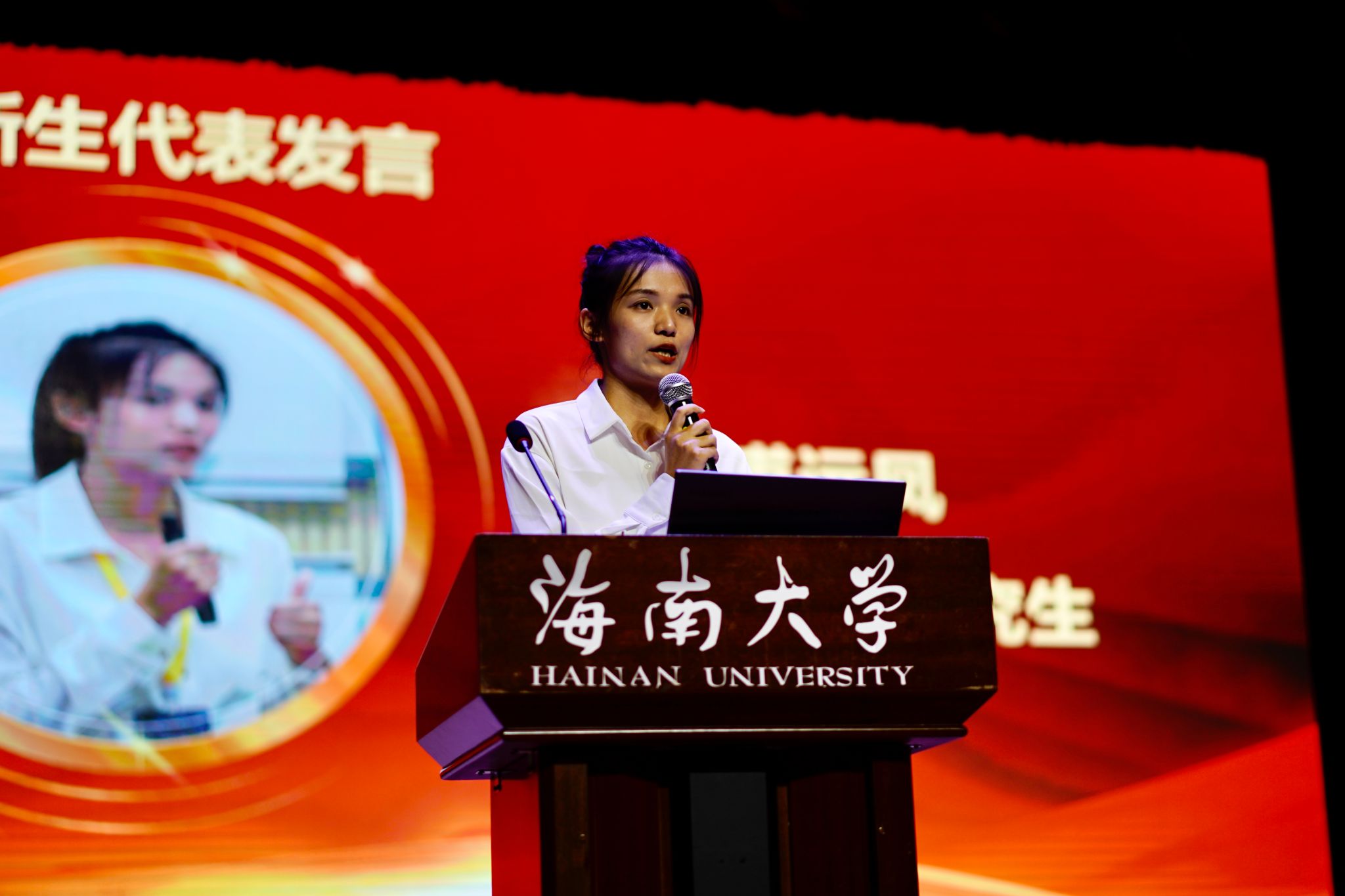 在学生代表发言环节中,国家奖学金获得者2020级谢诗琪同学代表全体老生对新生表示热烈欢迎。谢诗琪分享了丰富多彩的校园生活点滴,让新生对未来的学习生活充满期待。“心随学校律动,以身笃行校风校纪;牢记师长教诲,努力探求人生真谛;投身书籍海洋,全面汲取知识营养;融入社团活动,尽情放歌金色年华。”2023级本科生唐佳飞作为新生代表发言。他表示,作为新生,向往在海大实现蜕变,追寻理想;向往在海大汲取新知,拓展边界;向往在海大升华自我,迈向未来。研究生新生代表甫远凤同学发言时声音清亮,她表示要努力适应研究生学习生活,做药学事业的有用之才,在座的老师和同学报以热烈掌声。