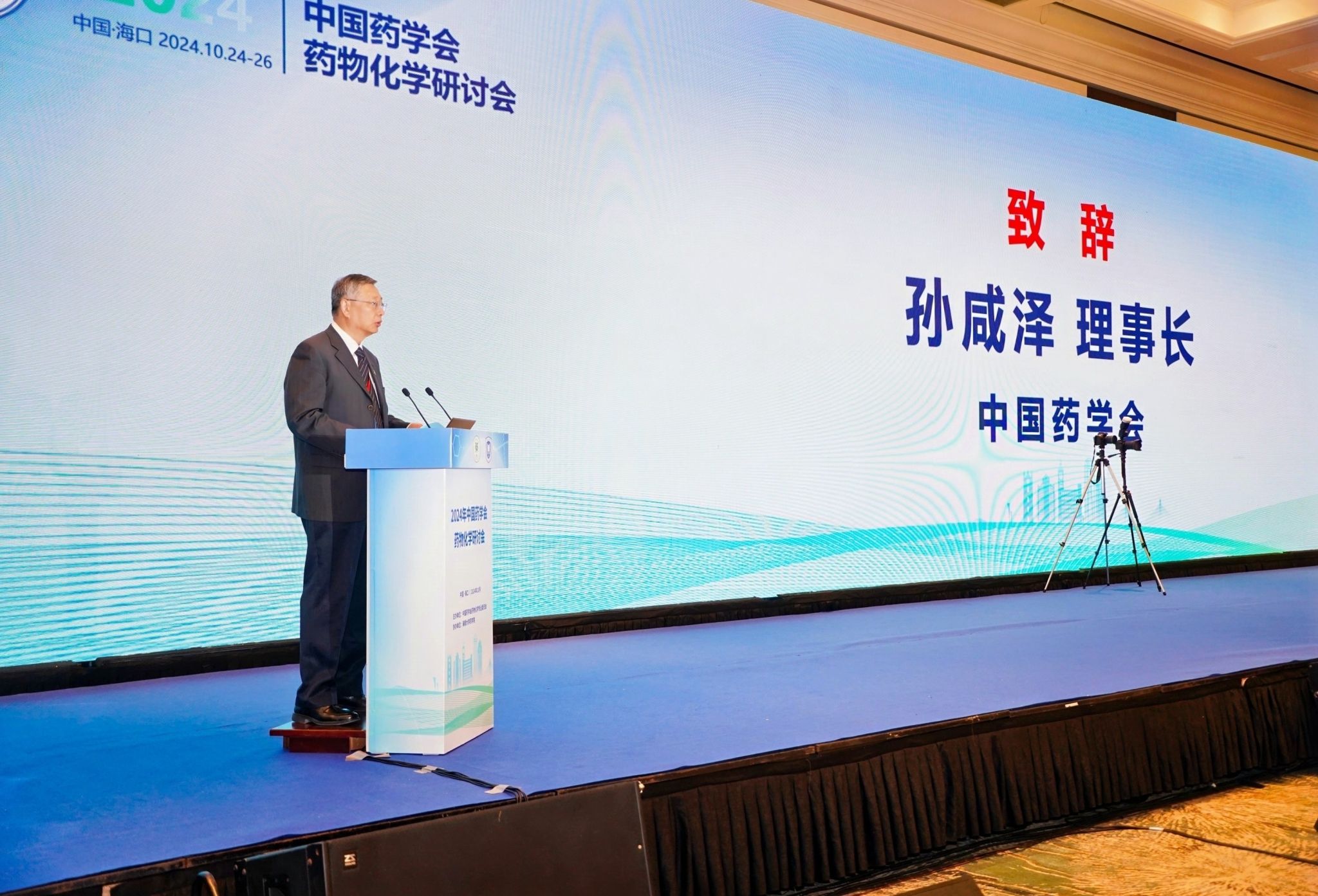 院长罗海彬主持大会开幕式。中国药学会理事会党委书记、理事长孙咸泽出席大会并致辞。他指出,党的二十届三中全会强调,要完善推动包括生物医药在内的新兴产业健康有序发展,健全支持创新药等发展机制,推动我国药物创新高质量发展。他强调生物医药制造业已成为推动经济发展的关键力量,在全球科技创新竞争愈发激烈的背景下,生物医药市场和研发趋势展现新的发展态势,肯定了海南自贸港在中国医药产业发展的积极探索。他强调,药物化学是药学科学的核心基础学科之一,也是生物医药产业的重要支柱。孙咸泽理事长表示,中国药学会将继续担当新时代赋予的使命,发挥学术组织的资源、人才与科技优势,推动中国药学事业的高质量发展,为生物医药产业的创新发展注入新的动力。