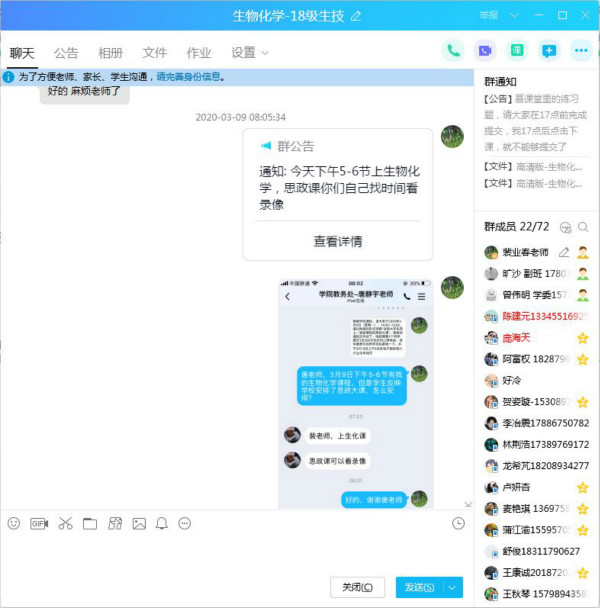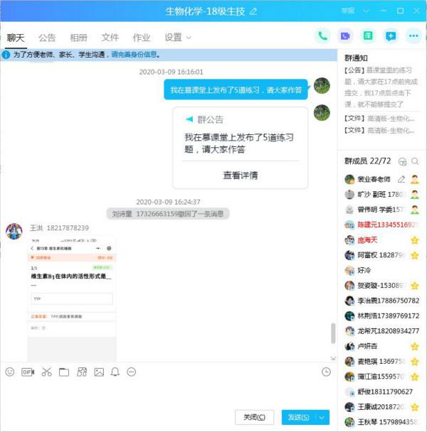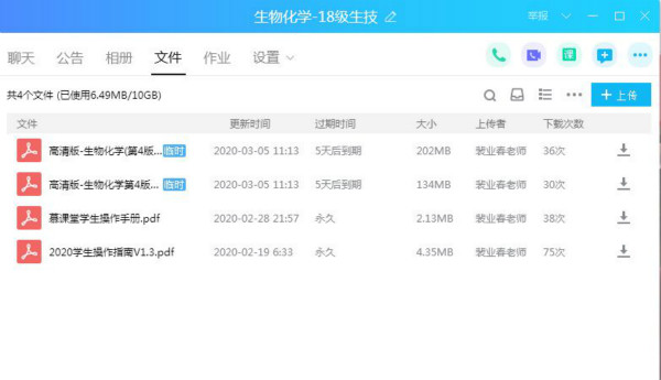 早在2月份,裴老师就开始认真学习MOOC网络教学平台的教学功能与操作方法,采用了南京大学杨荣武教授的结构生物化学中的部分教学视频,上传了部分教学资源,并建立了慕课堂和组建了QQ群。在QQ群里,提前上传慕课堂学生操作手册和电子版教材,并组织学生及时阅读与熟悉MOOC网络教学平台。