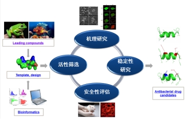 (1) 生物活性肽的发现:课题组长期致力于海南两栖动物活性蛋白多肽的研究,目前已对海南沼蛙,花狭口蛙海南亚种等活性多肽进行了深入研究。发现并命名Fejervarin等新型免疫肽、已知最短天然抗菌肽之一temporin家族抗菌肽等。并对天然活性肽进行结构与功能优化,获得了活性强,稳定性好,毒性低的衍生肽。
