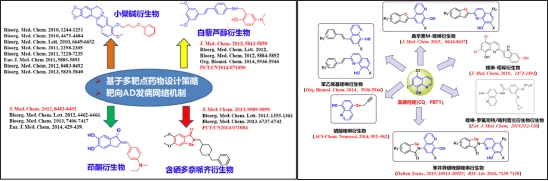 通过高通量药物筛选获得的活性天然产物小檗碱和白藜芦醇为先导化合物,设计和构建了小檗碱衍生物和白藜芦醇衍生物化合物库,筛选出2个具有多靶点抗AD的候选药物分子。该研究成果受到了国际国内同行的高度关注和认可,单篇最高引用数151次,申请人受邀撰写天然产物在AD药物研究方面的综述,其中发表在J. Med. Chem的论文受到“AD生物金属离子稳态失衡假说”提出人Ashley I. Bush教授评价称“化合物设计思路新颖、活性优异”,并应邀与其合作进行候选化合物R-22d新药开发研究。同时,团队设计和优化了新骨架喹啉衍生物,发现了具有PDE4抑制活性、可显著改善转基因小鼠认知记忆功能的多靶点抗AD药物WBQ5178,已与深圳海王药业有限公司签定协议合作进行后期开发(中科院大类一区top期刊论文JMC2015,授权专利ZL201510581395.3);发现了具有促进大脑海马成体神经形成、有望成为全新机制的神经退行性疾病治疗药物的先导化合物WI-1758(中科院大类一区top期刊论文JMC2018,授权专利ZL201711071039.2)。