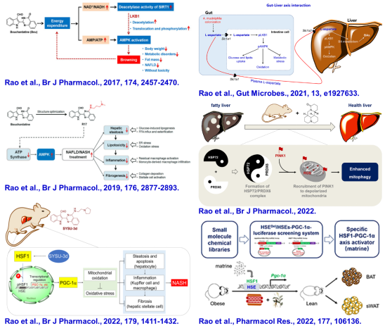 肝脏脂肪异位蓄积介导的肝脏损伤(肝细胞凋亡)、炎症与纤维化是非酒精性脂肪肝(NAFLD)与非酒精性脂肪肝炎(NASH)主要特征。其中,脂质蓄积介导的线粒体氧化应激与损伤是慢性脂肪性肝病关键机制。研究证实,增强肝脏线粒体氧化是NAFLD与NASH潜在有效干预策略,但肝脏线粒体代谢调控靶点与分子机制依然未知。以发展的高活性药物分子为分子工具,研究发现激活小鼠机体代谢或靶向增强肝脏线粒体代谢均可有效逆转小鼠NAFLD与NASH(Br J Pharmacol, 2017/2019/2022a; Pharmacol Res., 2022; Gut Microbes, 2021)。基于上述研究,我们首次提出:靶向激活肝脏HSF1或增加肝脏L-天冬氨酸水平是干预NASH的潜在新干预策略。近期,我们进一步研究发现增强肝脏HSP72与过氧化还原酶(PRDX6)相互作用可增强线粒体自噬,促进损伤线粒体降解与生物合成,从而治疗NAFLD(Br J Pharmacol., 2022b),首次揭示了HSP72调控肝脏线粒体代谢新功能。