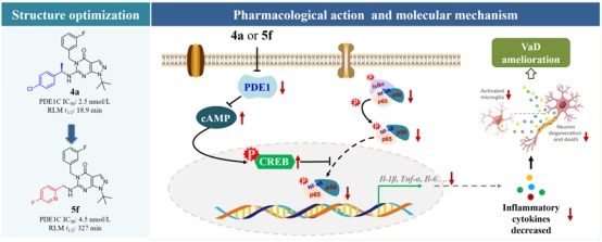 吴一诺副教授合作在前期报道的化合物3m基础上,通过结构改造发展了高抑制活性与高亚型选择性的PDE1抑制剂4a与5f。化合物抑制PDE1激活PKA/CREB通路,阻断炎症关键蛋白NF-κB磷酸化及其转录调节活性,抑制神经炎症,治疗VaD。同时,作者基于获得的构效关系进一步优化了化合物类药性,发展了第二代PDE1抑制剂5f。该研究将自主开发的高选择性PDE1抑制剂应用于VaD,提出了靶向抑制PDE1干预神经炎症治疗VaD的新策略及其可应用性,证实PDE1是VaD新药创制的潜在新靶标。该研究以PDE1蛋白为切入点,发展了新结构高活性、高选择性PDE1抑制剂,将靶向抑制PDE1与VaD联系在一起,揭示了靶向抑制PDE1阻断神经炎症治疗VaD分子机制。为神经炎症与VaD的创新药物研发提供原始创新的药物靶标以及结构基础。该项研究在Acta Pharmaceutica Sinica B(IF14.911)上发表题为Discovery of novel phosphodiesterase-1 inhibitors for curing vascular dementia: Suppression of neuroinflammation by blocking NF-κB transcription regulation and activating cAMP/CREB axis的研究论文。