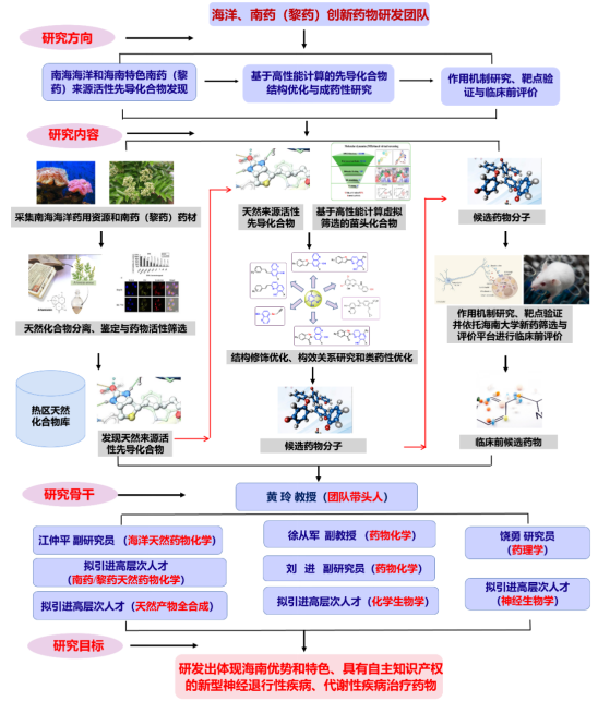 面向国家重大需求,团队以海南省热带特色药用作物与海洋资源为依托,聚焦“神经退行性疾病与慢性肝病创新药物”两个重大科学难题,结合天然药物化学、合成药物化学、化学生物学、计算机辅助药物设计、药理学、细胞分子生物学等理论及实验技术,在“高活性药物分子指导新靶点发现”与“新靶点指导创新药物设计优化”双重模式驱动下,致力于神经退行性疾病、慢性脂肪肝病等重大疾病的药化药理一体化研究,从而实现新药创制。当前,团队已配备天然药物化学、合成药物化学、药理学与细胞分子生物学等方向领域师资力量。