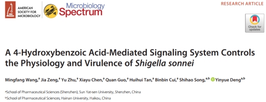 近日,色情网 色情网 耐药病原菌信号通讯与药物研发团队国际微生物学领域权威期刊Microbiology Spectrum(中科院1区,影响因子9.043)发表题为A 4-Hydroxybenzoic Acid-Mediated Signaling System Controls the Physiology and Virulence of Shigella sonnei的研究论文。研究发现S. sonnei可以合成并感知小分子信号对羟基苯甲酸(4-hydroxybenzoic acid4-HBA),该信号不仅在细菌-真菌跨界通讯交流中发挥重要作用,还可以调控S. sonnei的重要生理功能。